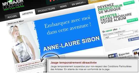 Une question se pose néanmoins : le label MyMajorCompany peut-il bannir de ses services une catégorie d'artistes qui ne correspondrait pas à ses attentes ? Leur système de production étant en effet ouvert à tous, à l'exception des artistes ayant signé directement ou indirectement un contrat d'enregistrement phonographique et/ou vidéographique avec quelque tiers que ce soit, au cours des cinq années civiles précédentes (mais aucun cas “à l'exception de ceux ayant participé à une émission de télé-réalité”). « Je ne comprends pas ce qu'il se passe. Je n'ai pas de contrat de disque ou d'edition depuis cinq ans, je n'ai absolument rien a me reprocher » déclare Anne-Laure Sibon sur son profil. A suivre...