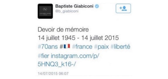 Baptiste Giabiconi fait depuis hier les frais de ses lacunes en histoire. En effet, aux premières lueurs du 14 juillet, le chanteur et modèle a posté un message patriotique destiné à ses 1,8 million de followers. Seulement, les mots qui auraient pu émouvoir les internautes les ont plutôt amusés... ou scandalisés pour certaines d'entre eux. « Devoir de mémoire. 14 juillet 1945 – 14 juillet 2015 #70 ans #France #paix #liberté #fier » a-t-il posté sur son compte Twitter, mélangeant le 8 mai 1945, date de l'Armistice de la Seconde Guerre mondiale, et le 14 juillet 1789, jour de Fête Nationale qui commémore la prise de la Bastille. Compte tenu des messages moqueurs postés par les internautes en réponse à son tweet, l'interprète de "Je te aime" a supprimé ces lignes quelques heures plus tard.