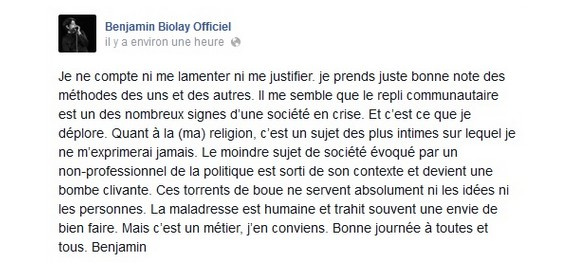 Expliquant tout d'abord qu'il ne compte pas se « lamenter » ni même se « justifier », le chanteur livre son opinion sur « les méthodes des uns et des autres ». « Le moindre sujet de société évoqué par un non-professionnel de la politique est sorti de son contexte et devient une bombe clivante » dit l'artiste, tout en suggérant que notre société est en crise et que « le repli communautaire » en est l'un des signes. Visant indirectement les médias qui s'en sont pris à lui ce week-end, Benjamin Biolay qualifie leurs articles de « torrents de boue » qui « ne servent absolument ni les idées ni les personnes ». « La maladresse est humaine et trahit souvent une envie de bien faire. Mais c’est un métier, j’en conviens » termine-t-il, pour s'excuser de ne pas avoir été assez clair dans son discours. Les artistes n'ont-ils donc pas le droit de profiter de leur notoriété pour véhiculer des idées ? Pour certains, comme Tryö ou Bernard Lavilliers, c'est un devoir.