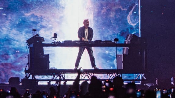 Et pour savourer plus de trois décennies passées au sommet, le roi des platines s'est donné une mission : faire danser les milliers de festivaliers sur le fil du souvenir. Devant un gigantesque monolithe, le décor de son actuelle tournée, le concert de David Guetta s'ouvre par les deux plus gros tubes de sa carrière, parus à 12 ans d'intervalle : "I'm Good (Blue)" avec Bebe Rexha et "Titanium", sa collaboration de légende avec Sia. La foule exulte sous les rayons laser, éblouie par les jeux de lumière qui se découpent dans le ciel d'un noir menaçant. Puis vibre grâce au savoir-faire du DJ, qui aimerait faire taire une bonne fois pour toutes les rumeurs qui affirment qu'il ne mixe pas en live. Entre ses mastodontes "I Gotta Feeling", "Love Is Gone" ou "Where Them Girls At", l'artiste intercale des mash-ups revisitant le "Satisfaction" de Benny Benassi au "Guess" de Charli xcx, ou des titres plus underground connus des puristes de l'électro comme ceux d'Anyma ou Tiësto. Le set, joyeusement récréatif, tient sur un équilibre savamment dosé par celui qui fait figure d'expert en la matière.