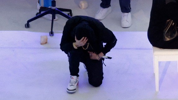 During the Super Bowl halftime show, Eminem took a knee and held his head after performing "Lose Yourself." An NFL spokesman said the league was aware that he was planning to kneel. https://t.co/lfYYWoqjMI pic.twitter.com/CPwt7TNBi6