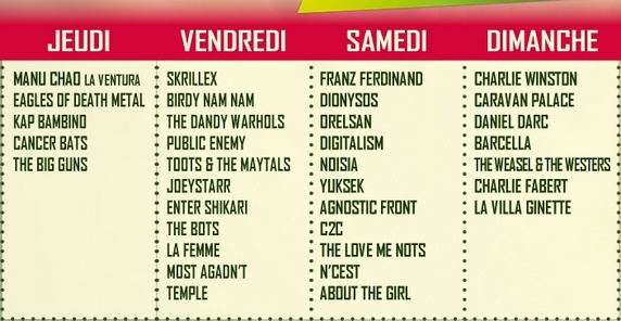 Ca y est, c'est bouclé ! On connait la liste complète des 34 artistes invités au prochain festival du Cabaret Vert, à Charleville-Mézières (Ardennes). Il y a en aura pour tous les gouts, du rock à l'électro, en passant par le rap et la pop.