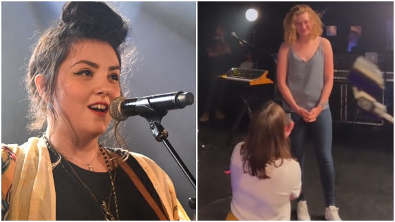 Dans la vidéo partagée sur les réseaux sociaux d'Hoshi, on voit la fameuse Emeline sur scène qui souhaite faire « passer un message d'amour » à « la femme qui partage [sa] vie ». Sa compagne montant sur scène, Emeline lui lance avec émotion : « Ça fait trois ans qu'on est ensemble, j'ai pas besoin de plus pour savoir que c'est avec toi que je veux passer le restant de ma vie. Je me souviens d'une fois où tu m'as dit "Si un jour tu fais une demande en mariage, fais quelque chose qui te ressemble". Tu me connais, je ne fais pas les choses à moitié. Alors c'est ce soir ! ». Sous les applaudissements du public, Emeline a ainsi sorti une bague et s'est mise à genoux pour demander à sa moitié, forcément émue, si elle voulait l'épouser. La réponse a évidemment été positive ! Une vidéo touchante, qui fait du bien et qui a déjà été vue plus de 30.000 fois sur les réseaux sociaux.