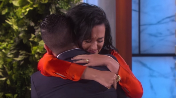 « Les paroles de cette chanson sont tellement puissantes. Chaque mot de cette chanson est puissant. Mon petit ami n'en peux déjà plus de cette chanson ! Je la joue en boucle » a-t-il déclaré à Elle DeGeneres, qui a voulu lui réserver une sacrée surprise : « Tu as déjà rencontré Katy ? Tu veux rencontrer Katy ? Voici Katy ! ». Au son de son single "Rise", Katy Perry a alors fait son entrée sur le plateau, déjà très émue, les larmes coulant sur ses joues. En s'approchant de Tony, lui aussi submergé par l'émotion, la chanteuse n'a pu se contenir et a éclaté en sanglot dans les bras de son fan. Un très beau moment. Leur accolade a alors duré de longues secondes, sous les applaudissements des spectateurs, eux aussi bouleversés. « Je tremble. On tremble tous les deux » a lancé Katy Perry, essayant d'apporter un peu de bonne humeur au milieu de ce moment d'émotion intense.