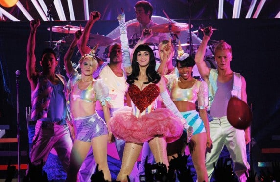 A ce sujet, pointons du doigt la très mauvaise interprétation du titre "Last Friday Night". Presque inaudible pour le peu qu’on l’ai entendue, sa voix n’était pas ajustée. C’est fort dommage car globalement, la chanteuse s’en sort plutôt bien. Mention spéciale pour la ballade "Not Like The Movies" : assise sur une balançoire trônant au dessus de la scène, l’artiste entonne avec émotion (et oui !) un titre au délicieux parfum de cartoons. Des images de Mickey et autres movies de Disney sont diffusées sur un tissu tendu. Niveau vocal, la chanteuse assure également une performance sur "Born This Way" de Lady GaGa. Lors d’un medley acoustique, Katy interprète une série de chansons qu’elle apprécie : « Je vais vous faire écouter les titres qui passent dans mon jukebox » (Le baladeur MP3 est un gadget trop récent pour être adapté à l’ambiance rétro de ce spectacle). Elle reprend également le morceau "Only Girl (In The World)" de son amie Rihanna.