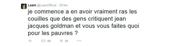Agacée de lire les nombreuses critiques qui visent les Enfoirés, la chanteuse Lââm est à son tour sortie de son silence. L'interprète de "Jamais loin de toi" a réaffirmé son soutien au groupe qu'elle rejoint quasiment chaque année depuis 2000. « Je commence a en avoir vraiment ras-les-couilles que des gens critiquent Jean-Jacques Goldman. Et vous, vous faites quoi pour les pauvres ? » a-t-elle tout d'abord lâché sur Twitter samedi, avant de répondre aux reproches concernant le single "Toute la vie" : « Jean-Jacques Goldman aime la jeunesse. Faut juste lire entre les lignes. La chanson, c'est un message d'espoir ».