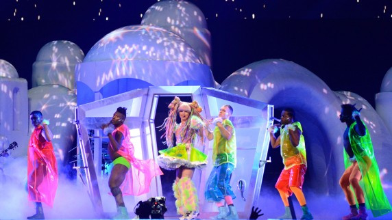 C'est avec le titre éponyme de son album "Artpop" que la chanteuse a ouvert la soirée, après avoir fait une entrée relativement sobre. Des ailes dans le dos, une boule bleue greffée sur le ventre et quelques pas de danse pour nous mettre dans l'ambiance : la chanteuse est allée à l'essentiel en faisant le choix de l'efficacité. Se sont ensuite enchaînés les titres de son dernier disque sans temps mort : "G.U.Y.", "Donatella" ou encore "MANiCURE". L'artiste de 28 ans a témoigné d'une grande vitalité et sa voix puissante - mais pas toujours très juste - nous a séduits. D'autant plus que le spectacle repose sur son énergie et non sur tous les artifices qui l'entourent.