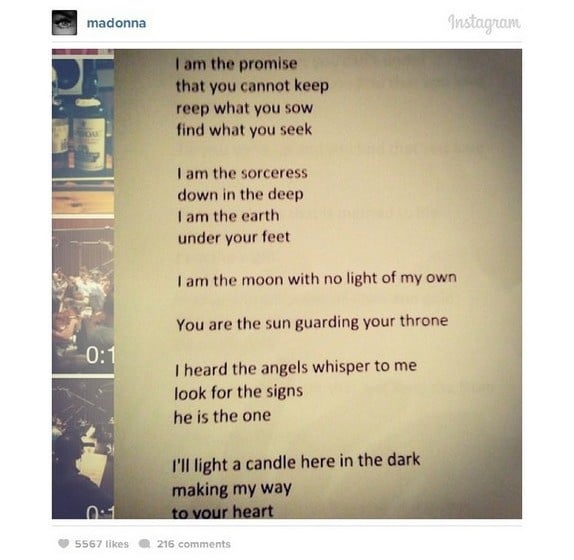 Le cliché posté par la chanteuse cet après-midi sur Instagram va dans ce sens. Cette fois-ci, ce sont les paroles du titre "Messiah" qui ont fait leur apparition, révélant un pan du caractère ésotérique de ce morceau, dans lequel il est question de sorcière, d'ange et de lune. En plus de cette partie de texte, Madonna a posté le message suivant sur son compte : « Salvation Through Art! #heart #messiah #livingforlov ». Ce n'est pas la première fois qu'elle utilise le hashtag #livingforlov. Doit-on penser que son nouvel opus portera ce nom ?