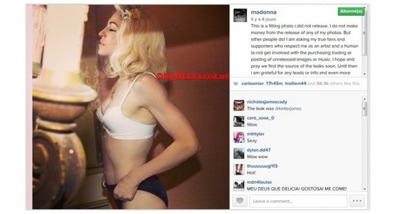Sur les réseaux sociaux, Madonna s'exprime à nouveau sur ces leaks qui sont devenus légion. « Je ne fais pas d'argent avec mes photos. Mais d'autres personnes le font ! Je demande à mes vrais fans et supporters qui me respectent en tant qu'artiste et en tant que femme de ne pas s'impliquer dans l'achat d'images inédites et de musique. J'espère et prie pour trouver la source des fuites bientôt » a-t-elle écrit, avant de demander à son public de s'impliquer dans la traque des coupables. Rappelons que La Madone avait déjà fait face au leak du titre "Give Me All Your Luvin'", premier extrait de son dernier album "MDNA" (2012), plusieurs mois avant sa sortie officielle.