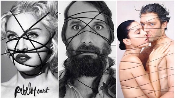 Sur le cliché en noir et blanc, on peut y voir le visage de Madonna encerclé par des fils noirs. Les fans ont tenté de comprendre sa signification, mais il faudrait poser la question au duo Mert & Marcus, les photographes qui se cachent derrière l'énigmatique portrait. Ce n'est pas la première fois qu'ils collaborent avec Madonna puisqu'ils ont réalisé le clip "Girl Gone Wild" et signé le photoshoot paru dans le dernier numéro du magazine "Interview", dans lequel l'interprète de "Vogue" pose seins nus. La pochette de "Rebel Heart", clairement en référence au bondage, n'est pas passée inaperçue... notamment car elle a rappelé de nombreuses autres photos aux internautes. La première ? La couverture du magazine "Studio" avec Vincent Cassel et Monica Bellucci en 2003 pour la sortie du film "Agents secrets", sous l'objectif de Jean-Baptiste Mondino.