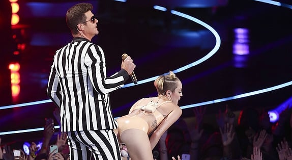 En effet, le 25 août 2012, Miley Cyrus, alors en plein comeback avec l'album "Bangerz", a repoussé les limites du sexy en interprétant son hit "We Can't Stop", dans une ambiance proche du clip trash. Autour de peluches géantes, la demoiselle s'est caressée l'entrejambe allègrement, avant de twerker contre Robin Thicke lors d'un sulfureux "Blurred Lines". Très proche de l'artiste masculin, Miley Cyrus n'a pas hésité à se frotter à lui, à lui lécher le cou ou à lui toucher les parties intimes, durant une performance longue de six minutes. « Le problème c'est ce que je ne peux plus enlever cette image de mon esprit » avait commencé la mère de Robin Thicke, bouche bée, tandis que de nombreuses stars s'étaient moquées d'elle et que les associations de parents s'étaient scandalisées de son attitude incontrôlable.