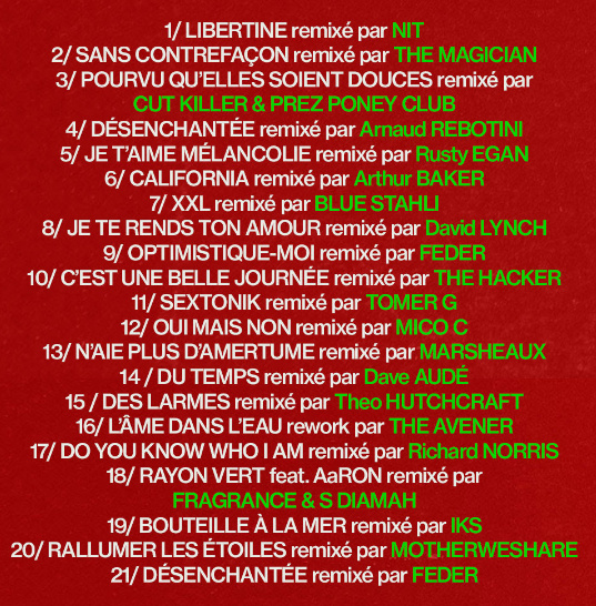 Concernant le répertoire revisité sur ce projet, il couvrira 40 décennies de succès dans un ordre plus ou moins chronologique. Le premier disque se focalisera davantage sur les tubes qui ont fait sa renommée jusque dans les années 2000 ("Sans contrefaçon", "California", "C'est une belle journée"...) tandis que la deuxième moitié n'inclura que des morceaux post-2010, à partir de "Oui mais non". De son dernier album "L'emprise" seront remixés les titres "Do You Know Who I Am", "Rayon vert", "Bouteille à la mer" et "Rallumer les étoiles". Plus qu'un mois à patienter avant de pouvoir se déhancher sur le dancefloor ! A noter qu'une édition triple vinyle sera également commercialisée.