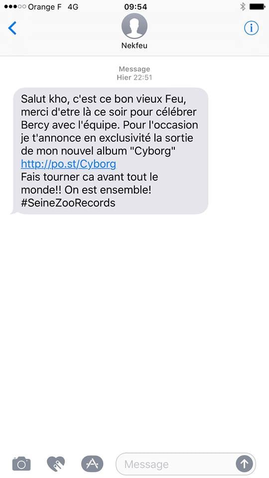 Une belle histoire qui ne fait que commencer ! Nekfeu est en effet de retour dans les bacs dès aujourd'hui avec "Cyborg", un deuxième album dévoilé par surprise... en plein concert ! Après avoir été invités à donner leurs numéros de téléphone avant le début du show via un mystérieux site affiché sur les écrans géants, les spectateurs présents hier soir à Bercy ont tous reçu en même temps un SMS leur indiquant la sortie de ce nouveau projet. « Vous voyez ce que c'est une vraie équipe de frères ? Dans le rap, c'est rare. C'est une équipe où ça ne leake pas avant la sortie ! » a lâché le rappeur sur scène, révélant au public la pochette de cet opus sur les écrans géants.