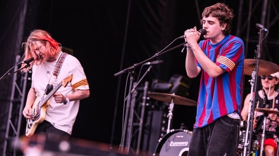 À 21 heures pétantes, le duo fait son entrée sur une scène dont le décor se compose d'une (fausse) crevette géante des plus kitsch. Accompagné de deux musiciens additionnels (un batteur et un claviériste), Royel Otis met tout le monde d'accord avec "Heading for the Door", un des sommets du premier album du groupe. La foule, dont la moyenne d'âge ne dépasse pas la trentaine, exulte et transforme la fosse en véritable trampoline géant. Un premier constat s'impose : les petits tubes pop du groupe prennent une dimension plus électrique sur scène. C'est aussi le cas sur les excellents "Adored", "Daisy Chain" ou d'un "Velvet" très 60's, faisant vibrer le public qui réserve un accueil magistral au groupe. Qui, à son tour, le remercie à de nombreuses reprises en français ! Et enchaîne les hymnes pop absolus, de "Going Kokomo" au récent "If Our Love Is Dead", qui s'impose déjà comme un classique de leur répertoire.