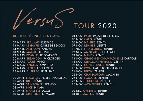 En plus de leur disque commun, Vitaa et Slimane donneront rendez-vous à leur public à partir du 7 mars 2020 à Beauvais pour le "VersuS Tour", une série de concerts qui fera escale dans les plus grands Zénith de France jusqu'au mois de décembre. Les deux artistes se montrent ambitieux : pas moins de 34 dates sont pour le moment programmées à Besançon, Tours, Niort, Bruxelles, Lille, Nice, Marseille, Caen, Nantes, Strasbourg, Limoges, Toulouse ou Orléans. Les coachs actuels de "The Voice Belgique" se produiront notamment au Palais des Sports de Paris le 4 novembre. Ouverture de la billetterie le 22 mai !