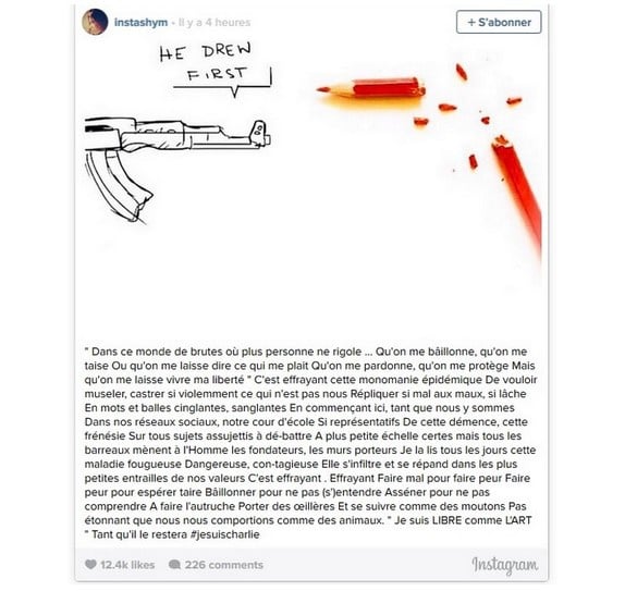 Shy'm a également tenu à exprimer son opinion et propose sur Instagram une lecture personnelle des événements, à partir des paroles de l'une de ses dernières chansons : "La malice". Désabusé, le rappeur Disiz a posté sur Facebook un long discours terminant par une phrase défaitiste : « La France est en deuil d'elle même, celle d'hier est morte elle ne sera plus jamais pareille ». D'autres, en revanche, comme Yannick Noah, Jenifer et Johnny Hallyday, ont simplement relayé le message "Je suis Charlie" sur fond noire, une image que beaucoup d'autres Français ont posté sur leur mur Facebook dans la journée du mercredi 7 janvier.